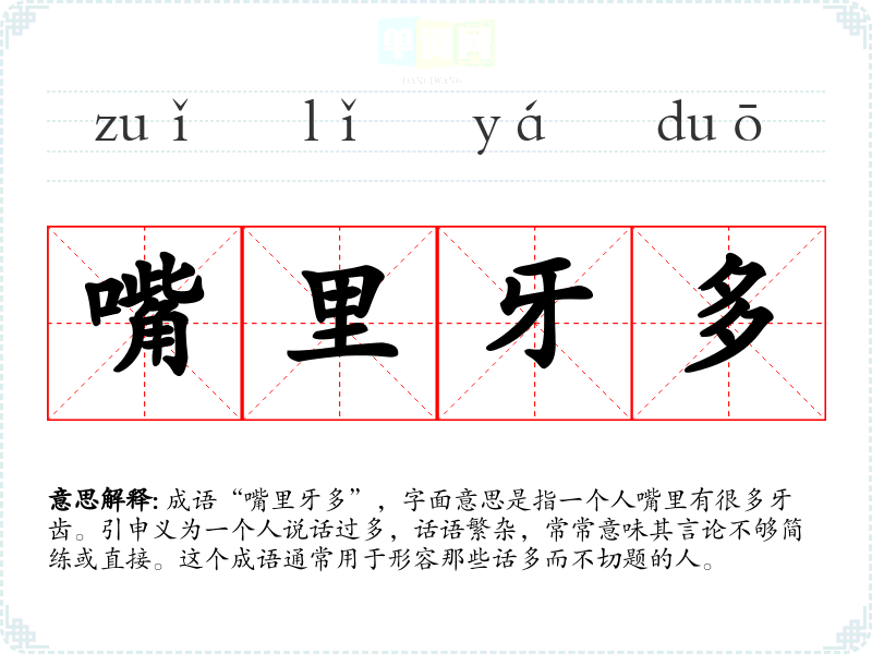 成语“嘴里牙多”,字面意思是指一个人嘴里有很多牙齿。引申义为一个人说话过多,话语繁杂,常常意味其言论不够简练或直接。这个成语通常用于形容那些话多而不切题的人。