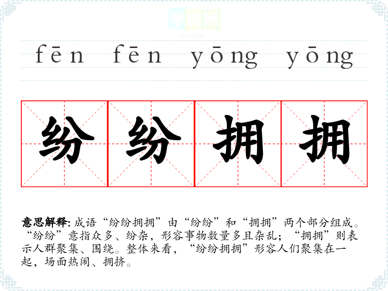 成语“纷纷拥拥”由“纷纷”和“拥拥”两个部分组成。“纷纷”意指众多、纷杂,形容事物数量多且杂乱;“拥拥”则表示人群聚集、围绕。整体来看,“纷纷拥拥”形容人们聚集在一起,场面热闹、拥挤。