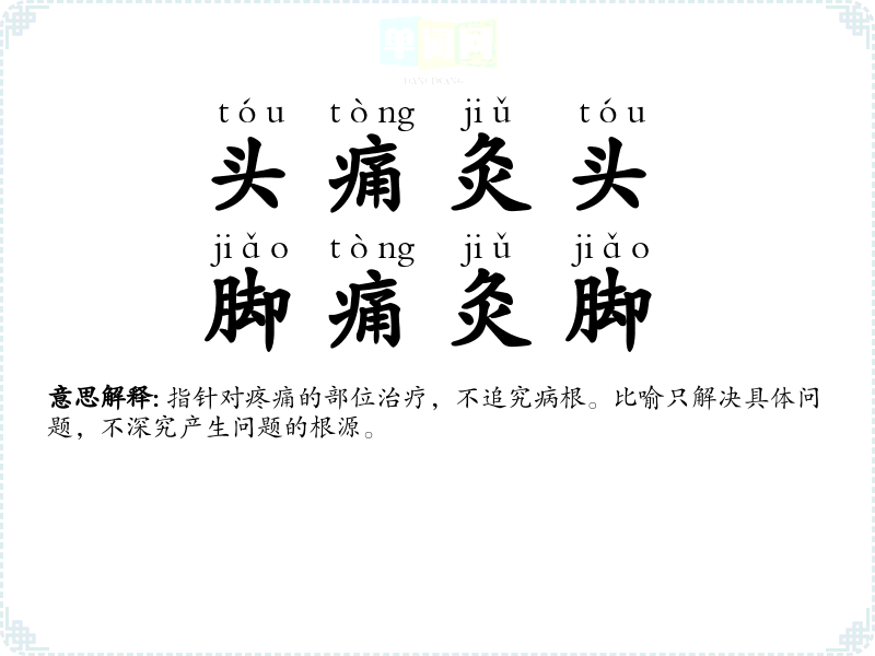 | 不痛不痒 | 既不是痛,也不是痒。原形容说不出的一种难受。现多比喻不触及实质,不切中要害,不解决问题。 |