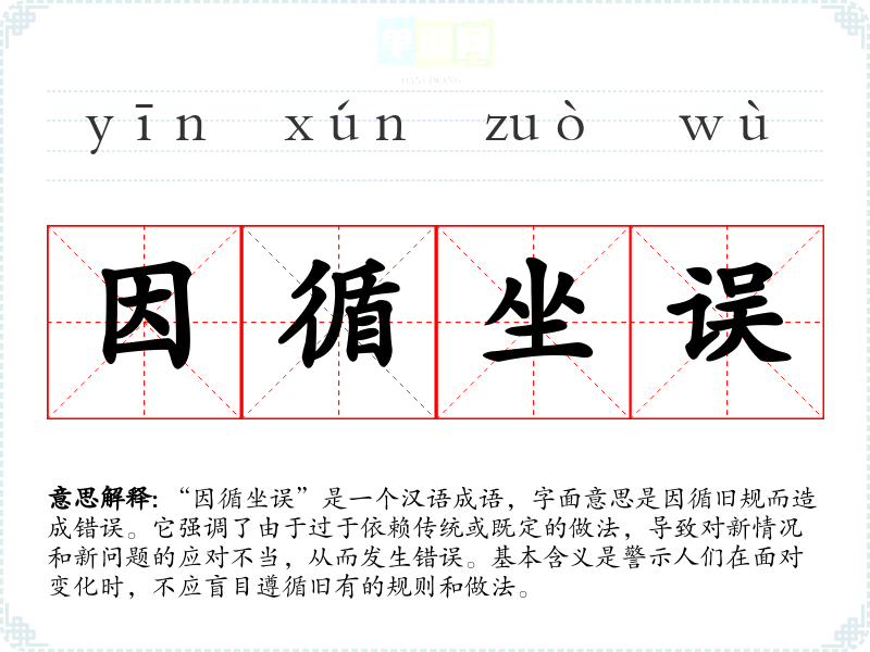 “因循坐误”是一个汉语成语,字面意思是因循旧规而造成错误。它强调了由于过于依赖传统或既定的做法,导致对新情况和新问题的应对不当,从而发生错误。基本含义是警示人们在面对变化时,不应盲目遵循旧有的规则和做法。