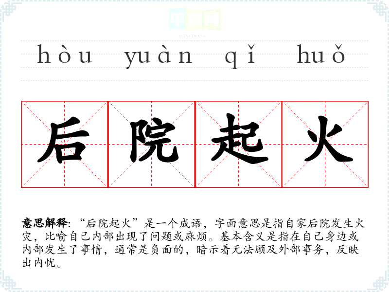 “后院起火”是一个成语,字面意思是指自家后院发生火灾,比喻自己内部出现了问题或麻烦。基本含义是指在自己身边或内部发生了事情,通常是负面的,暗示着无法顾及外部事务,反映出内忧。
