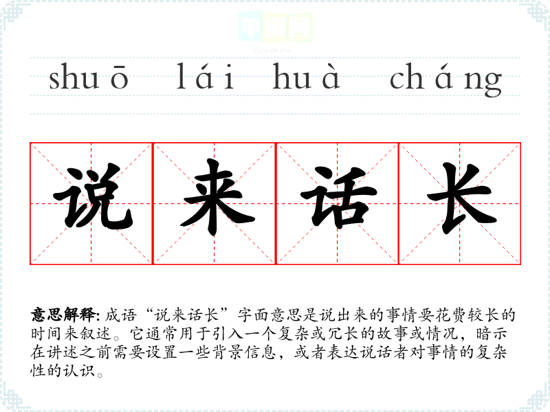 成语“说来话长”字面意思是说出来的事情要花费较长的时间来叙述。它通常用于引入一个复杂或冗长的故事或情况,暗示在讲述之前需要设置一些背景信息,或者表达说话者对事情的复杂性的认识。