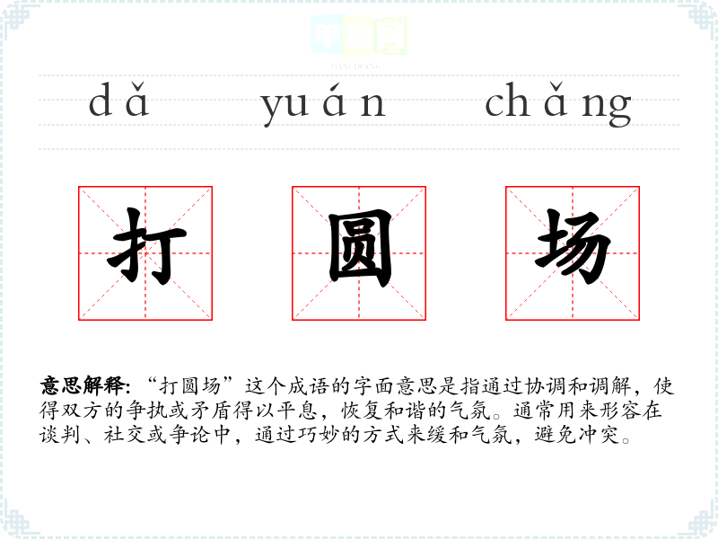 “打圆场”这个成语的字面意思是指通过协调和调解,使得双方的争执或矛盾得以平息,恢复和谐的气氛。通常用来形容在谈判、社交或争论中,通过巧妙的方式来缓和气氛,避免冲突。