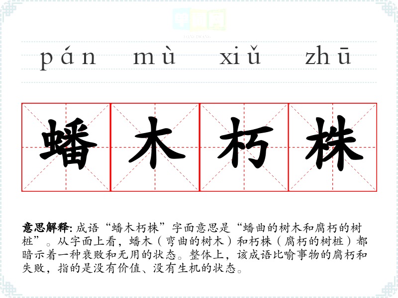 成语“蟠木朽株”字面意思是“蟠曲的树木和腐朽的树桩”。从字面上看,蟠木(弯曲的树木)和朽株(腐朽的树桩)都暗示着一种衰败和无用的状态。整体上,该成语比喻事物的腐朽和失败,指的是没有价值、没有生机的状态。