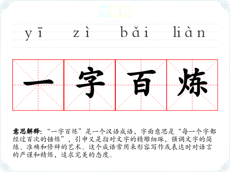 “一字百炼”是一个汉语成语,字面意思是“每一个字都经过百次的锤炼”,引申义是指对文字的精雕细琢,强调文字的简练、准确和修辞的艺术。这个成语常用来形容写作或表达时对语言的严谨和精炼,追求完美的态度。