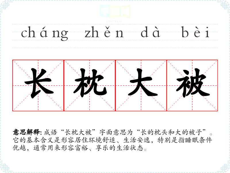 成语“长枕大被”字面意思为“长的枕头和大的被子”。它的基本含义是形容居住环境舒适、生活安逸,特别是指睡眠条件优越,通常用来形容富裕、享乐的生活状态。
