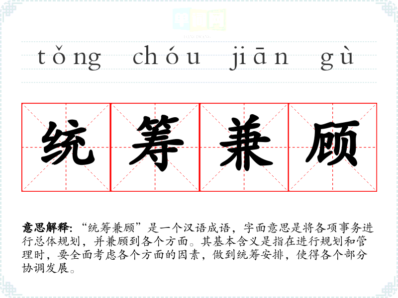 “统筹兼顾”是一个汉语成语,字面意思是将各项事务进行总体规划,并兼顾到各个方面。其基本含义是指在进行规划和管理时,要全面考虑各个方面的因素,做到统筹安排,使得各个部分协调发展。