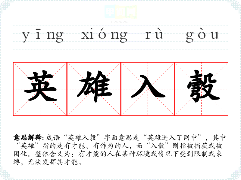 成语“英雄入彀”字面意思是“英雄进入了网中”,其中“英雄”指的是有才能、有作为的人,而“入彀”则指被捕获或被困住。整体含义为:有才能的人在某种环境或情况下受到限制或束缚,无法发挥其才能。