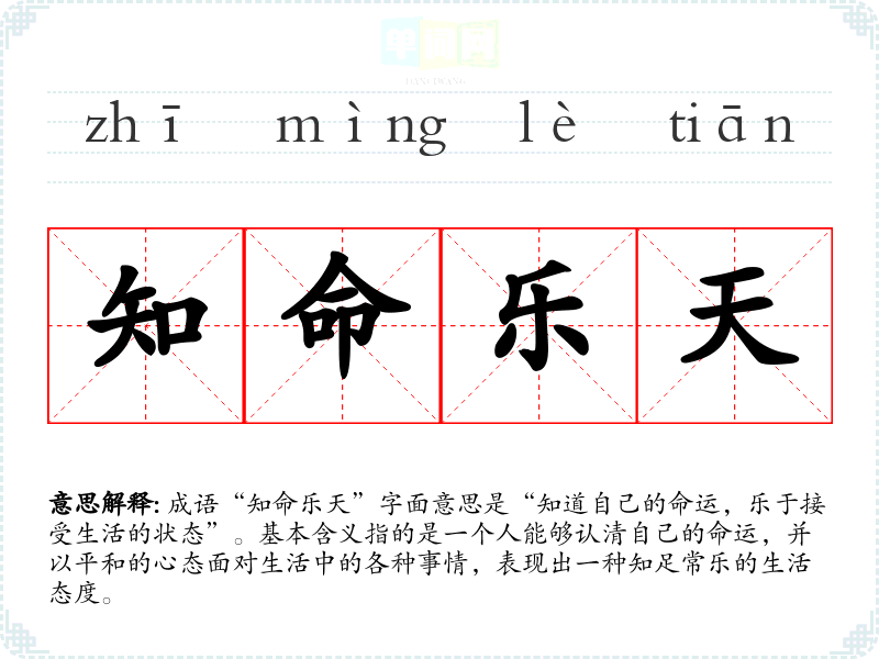 成语“知命乐天”字面意思是“知道自己的命运,乐于接受生活的状态”。基本含义指的是一个人能够认清自己的命运,并以平和的心态面对生活中的各种事情,表现出一种知足常乐的生活态度。