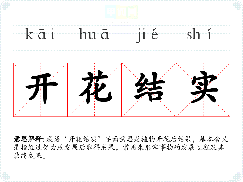 | 开华结果 | 比喻修养、学习、工作等有了成绩,取得效果。 |