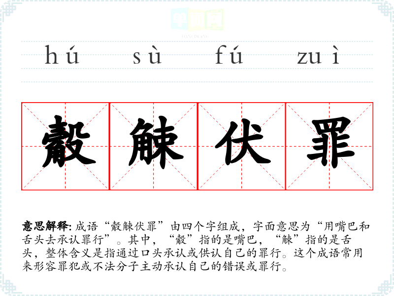 成语“觳觫伏罪”由四个字组成,字面意思为“用嘴巴和舌头去承认罪行”。其中,“觳”指的是嘴巴,“觫”指的是舌头,整体含义是指通过口头承认或供认自己的罪行。这个成语常用来形容罪犯或不法分子主动承认自己的错误或罪行。