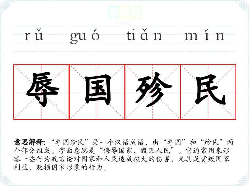 “辱国殄民”是一个汉语成语,由“辱国”和“殄民”两个部分组成。字面意思是“侮辱国家,毁灭人民”。它通常用来形容一些行为或言论对国家和人民造成极大的伤害,尤其是背叛国家利益、贬损国家形象的行为。
