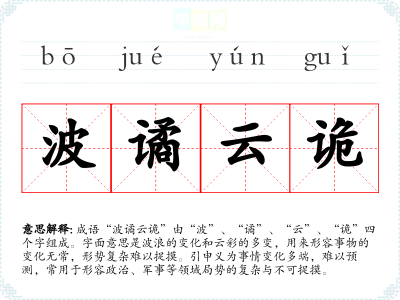 成语“波谲云诡”由“波”、“谲”、“云”、“诡”四个字组成。字面意思是波浪的变化和云彩的多变,用来形容事物的变化无常,形势复杂难以捉摸。引申义为事情变化多端,难以预测,常用于形容政治、军事等领域局势的复杂与不可捉摸。