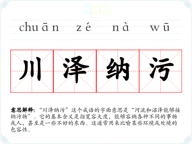“川泽纳污”这个成语的字面意思是“河流和沼泽能够接纳污物”。它的基本含义是指宽容大度,能够容纳各种不同的事物或人,甚至是一些不好的东西。这通常用来比喻某些环境或处境的包容性。