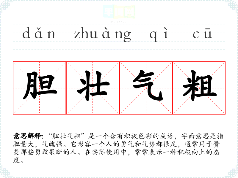 “胆壮气粗”是一个含有积极色彩的成语,字面意思是指胆量大,气魄强。它形容一个人的勇气和气势都很足,通常用于赞美那些勇敢果断的人。在实际使用中,常常表示一种积极向上的态度。