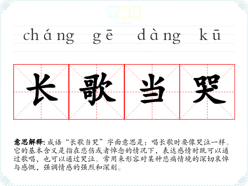 成语“长歌当哭”字面意思是:唱长歌时要像哭泣一样。它的基本含义是指在悲伤或者悼念的情况下,表达感情时既可以通过歌唱,也可以通过哭泣。常用来形容对某种悲痛情境的深切哀悼与感慨,强调情感的强烈和深刻。
