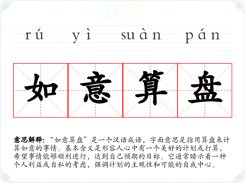 “如意算盘”是一个汉语成语,字面意思是指用算盘来计算如意的事情。基本含义是形容人心中有一个美好的计划或打算,希望事情能够顺利进行,达到自己预期的目标。它通常暗示着一种个人利益或自私的考虑,强调计划的主观性和可能的自我中心。