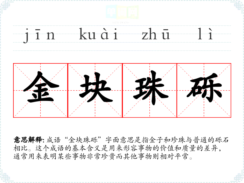 成语“金块珠砾”字面意思是指金子和珍珠与普通的砾石相比。这个成语的基本含义是用来形容事物的价值和质量的差异,通常用来表明某些事物非常珍贵而其他事物则相对平常。