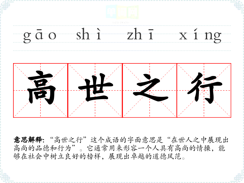 “高世之行”这个成语的字面意思是“在世人之中展现出高尚的品德和行为”。它通常用来形容一个人具有高尚的情操,能够在社会中树立良好的榜样,展现出卓越的道德风范。