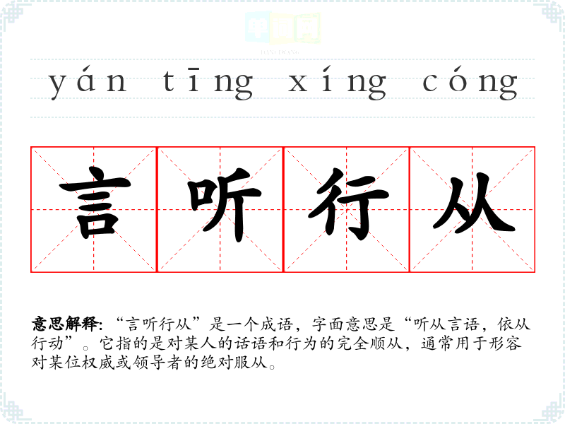 “言听行从”是一个成语,字面意思是“听从言语,依从行动”。它指的是对某人的话语和行为的完全顺从,通常用于形容对某位权威或领导者的绝对服从。