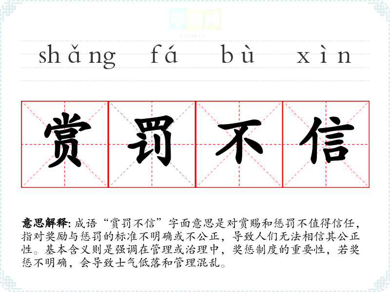 成语“赏罚不信”字面意思是对赏赐和惩罚不值得信任,指对奖励与惩罚的标准不明确或不公正,导致人们无法相信其公正性。基本含义则是强调在管理或治理中,奖惩制度的重要性,若奖惩不明确,会导致士气低落和管理混乱。