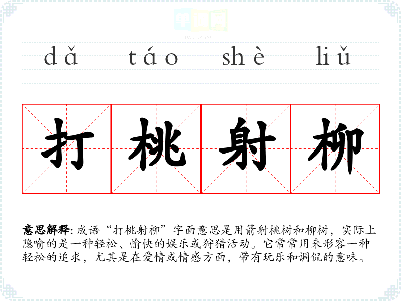 成语“打桃射柳”字面意思是用箭射桃树和柳树,实际上隐喻的是一种轻松、愉快的娱乐或狩猎活动。它常常用来形容一种轻松的追求,尤其是在爱情或情感方面,带有玩乐和调侃的意味。