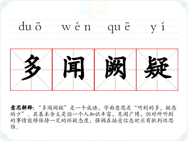 | 多闻阙疑 | 闻:听;阙疑:有疑问的地方要保留。虽然见多识广,有不懂之处,还应存有疑问。指谦虚谨慎的治学态度。 |