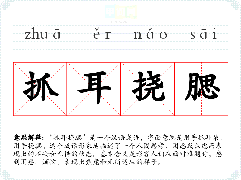 在**文化中,成语常常是用以传递智慧与经验的工具。“抓耳挠腮”反映了人们面对复杂问题时的普遍心理状态,这种情感在现代社会中依然适用。在快节奏的生活中,许多人常常感到焦虑和困扰,因此这个成语的使用仍然频繁。