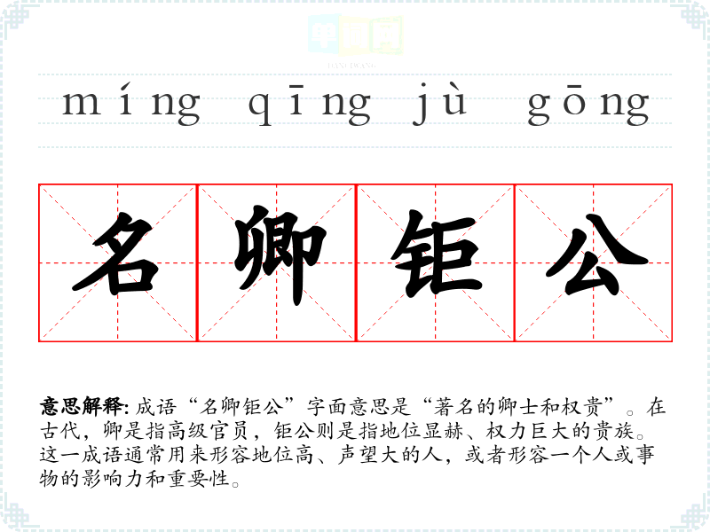 成语“名卿钜公”字面意思是“著名的卿士和权贵”。在古代,卿是指高级官员,钜公则是指地位显赫、权力巨大的贵族。这一成语通常用来形容地位高、声望大的人,或者形容一个人或事物的影响力和重要性。