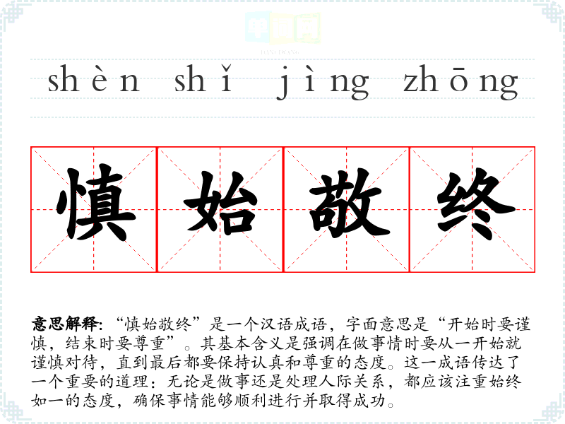 “慎始敬终”是一个汉语成语,字面意思是“开始时要谨慎,结束时要尊重”。其基本含义是强调在做事情时要从一开始就谨慎对待,直到最后都要保持认真和尊重的态度。这一成语传达了一个重要的道理:无论是做事还是处理人际关系,都应该注重始终如一的态度,确保事情能够顺利进行并取得成功。