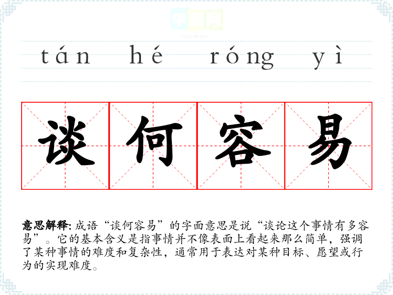 成语“谈何容易”的字面意思是说“谈论这个事情有多容易”。它的基本含义是指事情并不像表面上看起来那么简单,强调了某种事情的难度和复杂性,通常用于表达对某种目标、愿望或行为的实现难度。