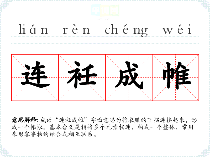 成语“连衽成帷”字面意思为将衣服的下摆连接起来,形成一个帷帐。基本含义是指将多个元素相连,构成一个整体,常用来形容事物的结合或相互联系。