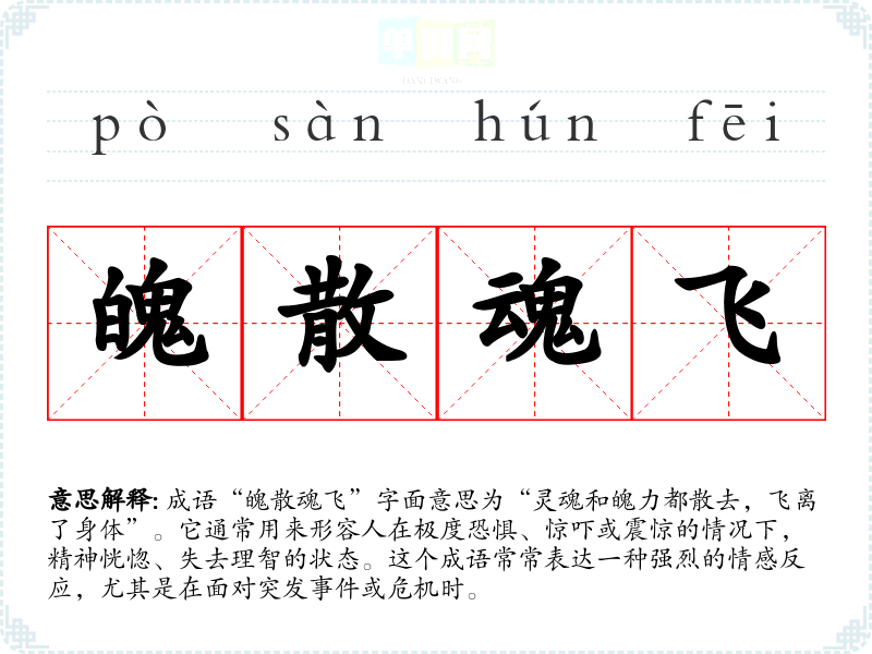 成语“魄散魂飞”字面意思为“灵魂和魄力都散去,飞离了身体”。它通常用来形容人在极度恐惧、惊吓或震惊的情况下,精神恍惚、失去理智的状态。这个成语常常表达一种强烈的情感反应,尤其是在面对突发**或危机时。