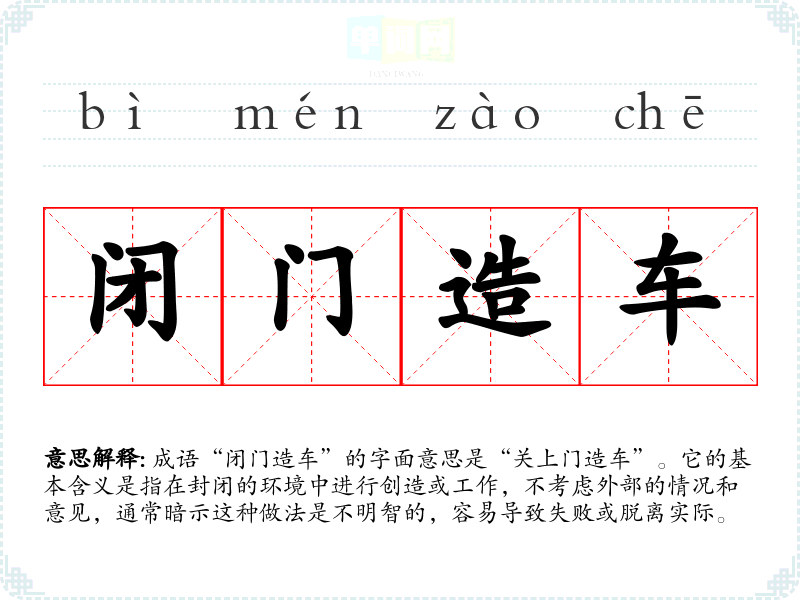成语“闭门造车”的字面意思是“关上门造车”。它的基本含义是指在封闭的环境中进行创造或工作,不考虑外部的情况和意见,通常暗示这种做法是不明智的,容易导致失败或脱离实际。