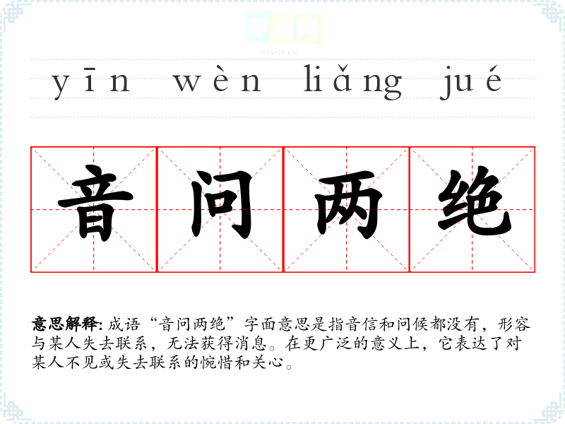 成语“音问两绝”字面意思是指音信和问候都没有,形容与某人失去联系,无法获得消息。在更广泛的意义上,它表达了对某人不见或失去联系的惋惜和关心。