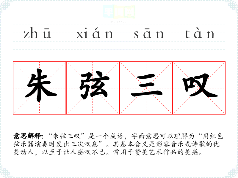 “朱弦三叹”是一个成语,字面意思可以理解为“用红色弦乐器演奏时发出三次叹息”。其基本含义是形容音乐或诗歌的优美动人,以至于让人感叹不已。常用于赞美艺术作品的美感。