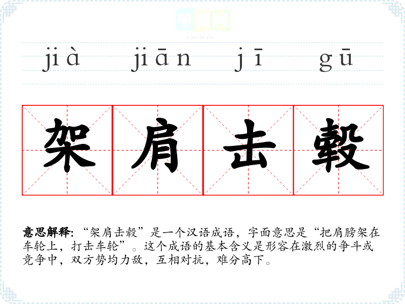 “架肩击毂”是一个汉语成语,字面意思是“把肩膀架在车轮上,打击车轮”。这个成语的基本含义是形容在激烈的争斗或竞争中,双方势均力敌,互相对抗,难分高下。