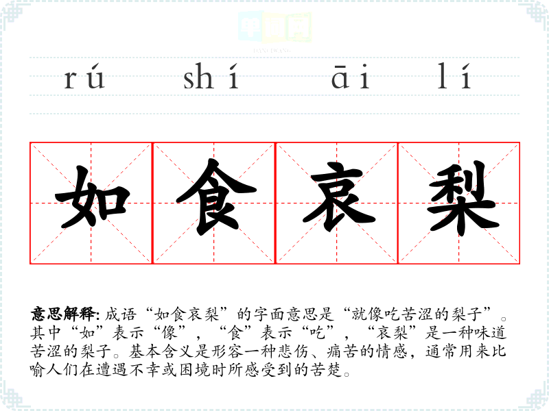 成语“如食哀梨”的字面意思是“就像吃苦涩的梨子”。其中“如”表示“像”,“食”表示“吃”,“哀梨”是一种味道苦涩的梨子。基本含义是形容一种悲伤、痛苦的情感,通常用来比喻人们在遭遇不幸或困境时所感受到的苦楚。