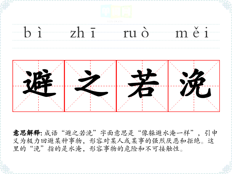 成语“避之若浼”字面意思是“像躲避水淹一样”,引申义为极力回避某种事物,形容对某人或某事的强烈厌恶和拒绝。这里的“浼”指的是水淹,形容事物的危险和不可接触性。