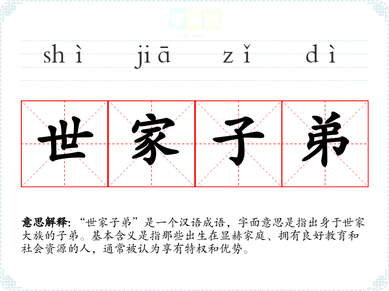 “世家子弟”是一个汉语成语,字面意思是指出身于世家大族的子弟。基本含义是指那些出生在显赫家庭、拥有良好教育和社会资源的人,通常被认为享有特权和优势。