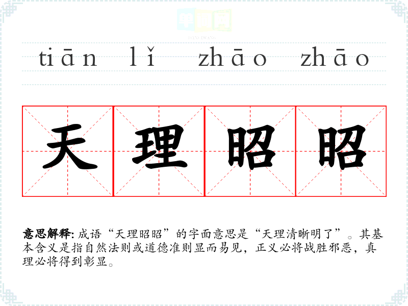 “天理昭昭”一词源于**古代儒家思想,强调天理(即自然法则或道德理想)是普遍存在的,并且在一定条件下会被揭示出来。虽然没有明确的文献出处,但类似的思想在《论语》、《孟子》等经典中均有所体现,传达了正义和道德最终会得到体现的信念。