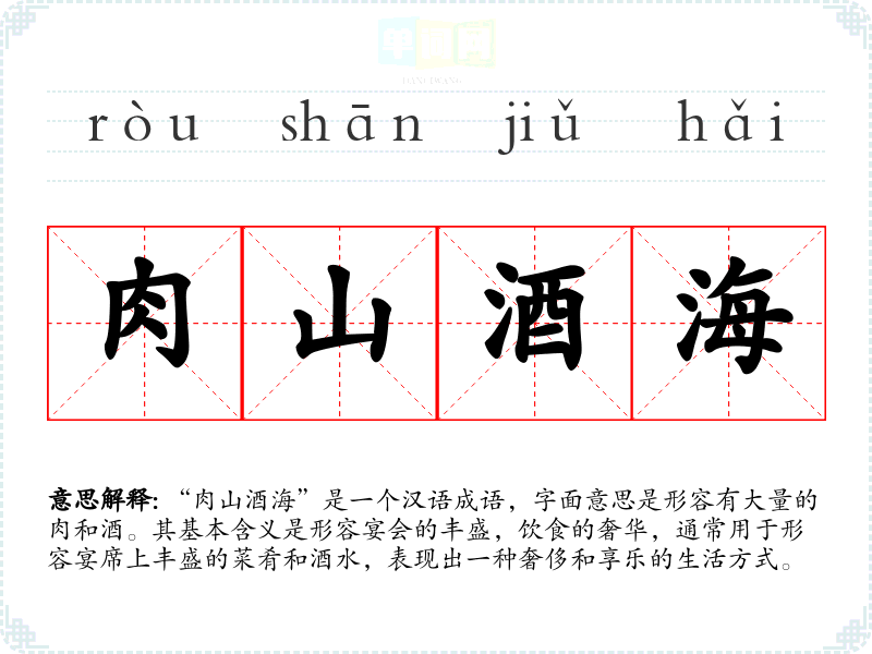 “肉山酒海”是一个汉语成语,字面意思是形容有大量的肉和酒。其基本含义是形容宴会的丰盛,饮食的奢华,通常用于形容宴席上丰盛的菜肴和酒水,表现出一种奢侈和享乐的生活方式。