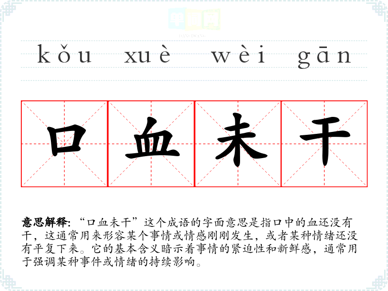 “口血未干”这个成语的字面意思是指口中的血还没有干,这通常用来形容某个事情或情感刚刚发生,或者某种情绪还没有平复下来。它的基本含义暗示着事情的紧迫性和新鲜感,通常用于强调某种**或情绪的持续影响。