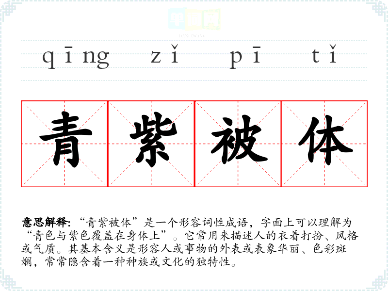 “青紫被体”是一个形容词性成语,字面上可以理解为“青色与紫色覆盖在身体上”。它常用来描述人的衣着打扮、风格或气质。其基本含义是形容人或事物的外表或表象华丽、色彩斑斓,常常隐含着一种种族或文化的独特性。