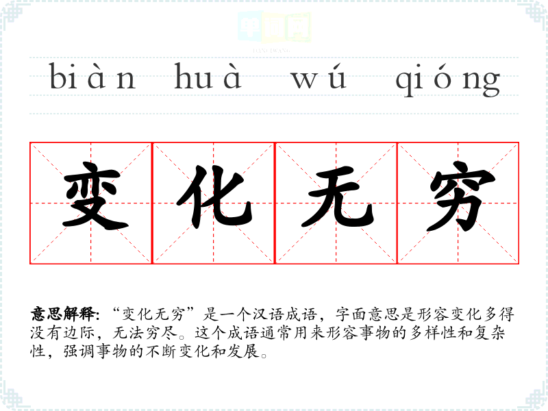 “变化无穷”是一个汉语成语,字面意思是形容变化多得没有边际,无法穷尽。这个成语通常用来形容事物的多样性和复杂性,强调事物的不断变化和发展。