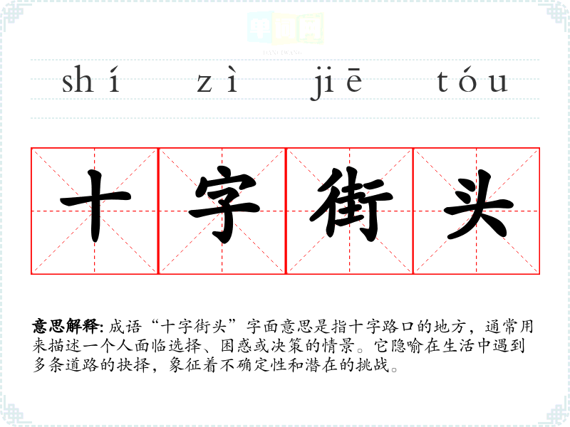 “十字街头”并没有特定的历史典故或文学出处,更多是由日常生活中的场景演化而来。它反映了人们在生活中常常会遇到的选择情况,这种场景在**古代和现代社会中都普遍存在。