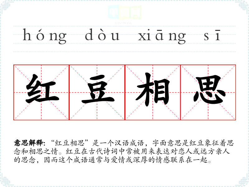 “红豆相思”是一个汉语成语,字面意思是红豆象征着思念和相思之情。红豆在古代诗词中常被用来表达对恋人或远方亲人的思念,因而这个成语通常与爱情或深厚的情感联系在一起。