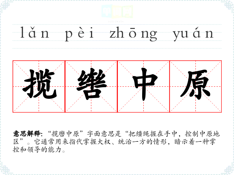 “揽辔中原”字面意思是“把缰绳握在手中,控制中原地区”。它通常用来指代掌握大权、统治一方的情形,暗示着一种掌控和领导的能力。