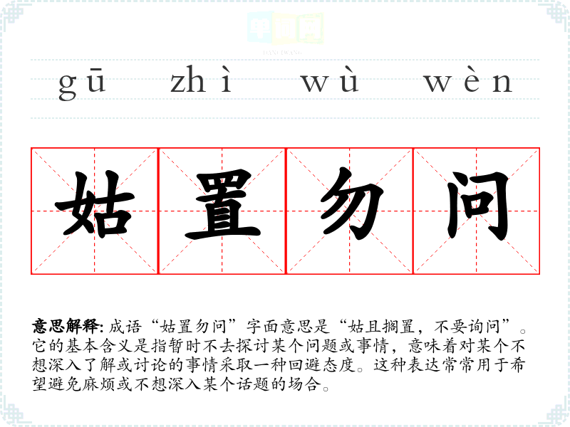 成语“姑置勿问”字面意思是“姑且搁置,不要询问”。它的基本含义是指暂时不去探讨某个问题或事情,意味着对某个不想深入了解或讨论的事情采取一种回避态度。这种表达常常用于希望避免麻烦或不想深入某个话题的场合。