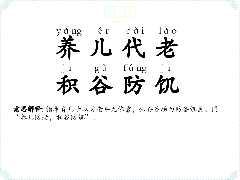 | 养儿代老,积谷防饥 | 指养育儿子以防老年无依靠,保存谷物为防备饥荒。同“养儿防老,积谷防饥”。 |